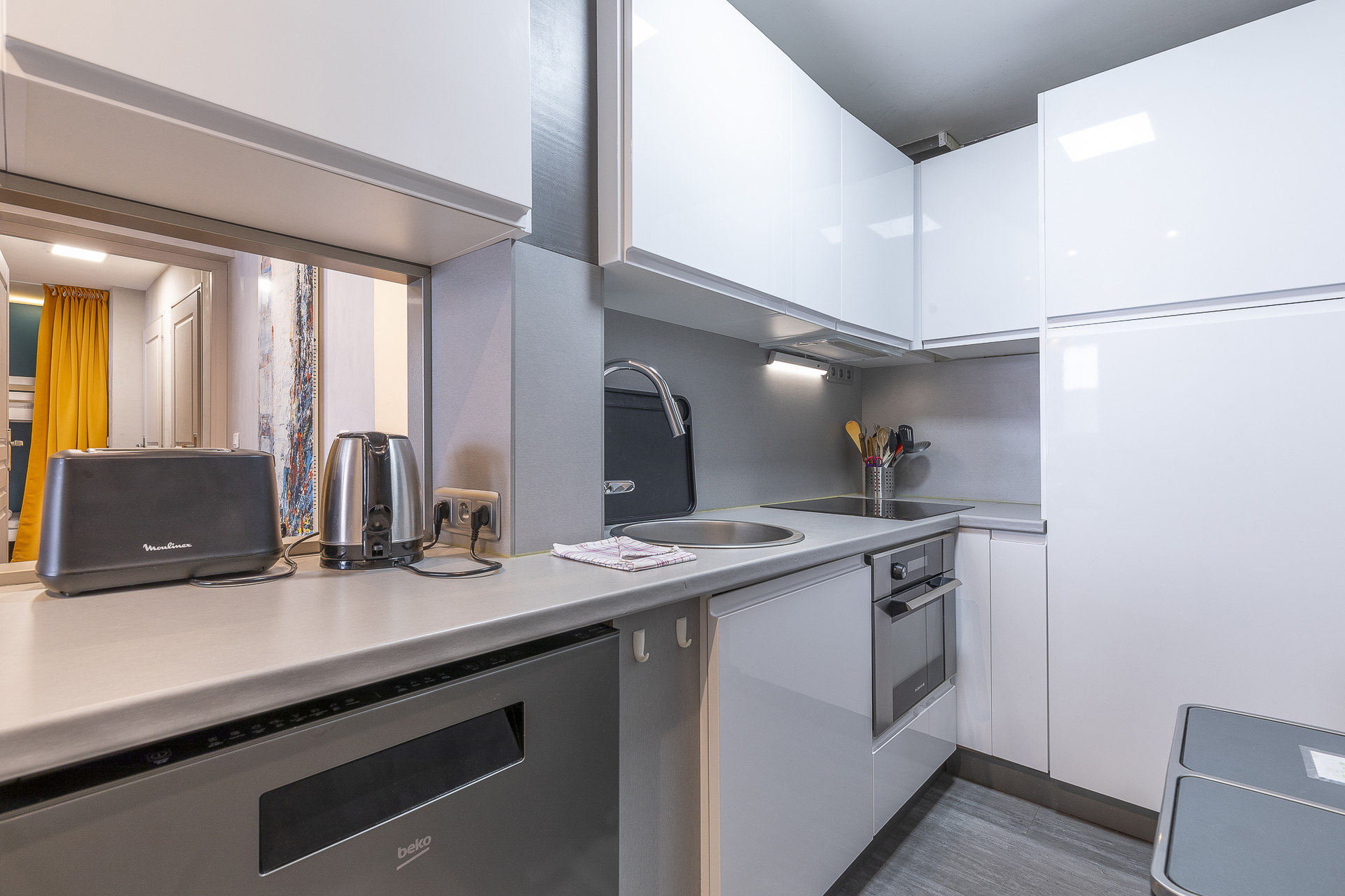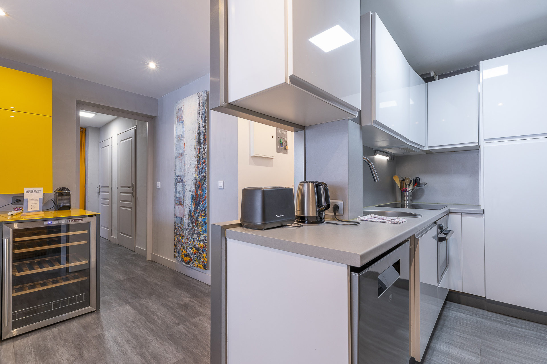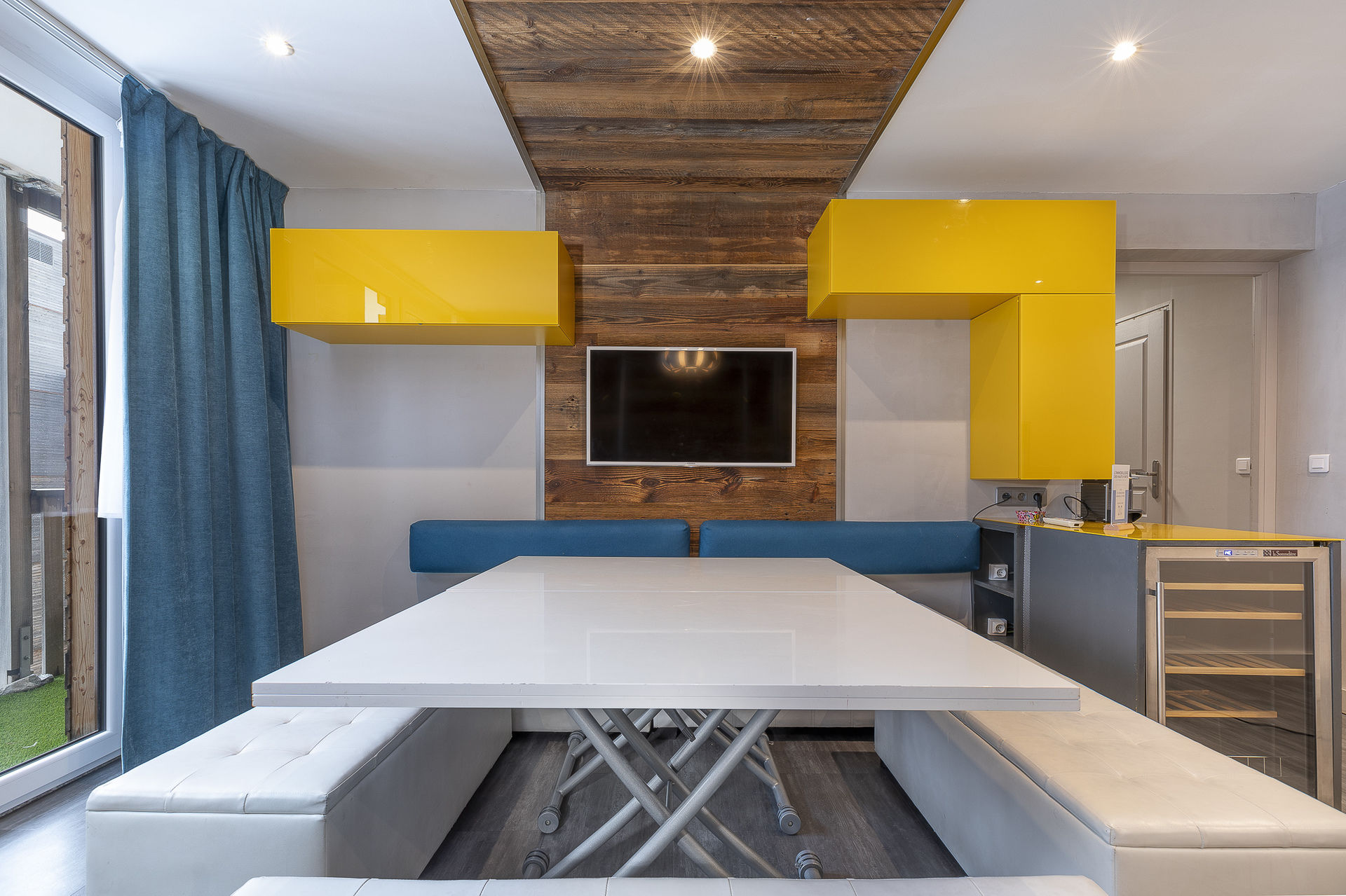 The main living space features a cosy, modern and colourful lounge — the perfect place to relax after a day on the slopes. The open-plan kitchen is fully equipped (fridge, combined oven/microwave, dishwasher, wine fridge, Nespresso Pro coffee machine*, etc.), making it easy to prepare shared meals. This space opens onto an east-facing balcony.