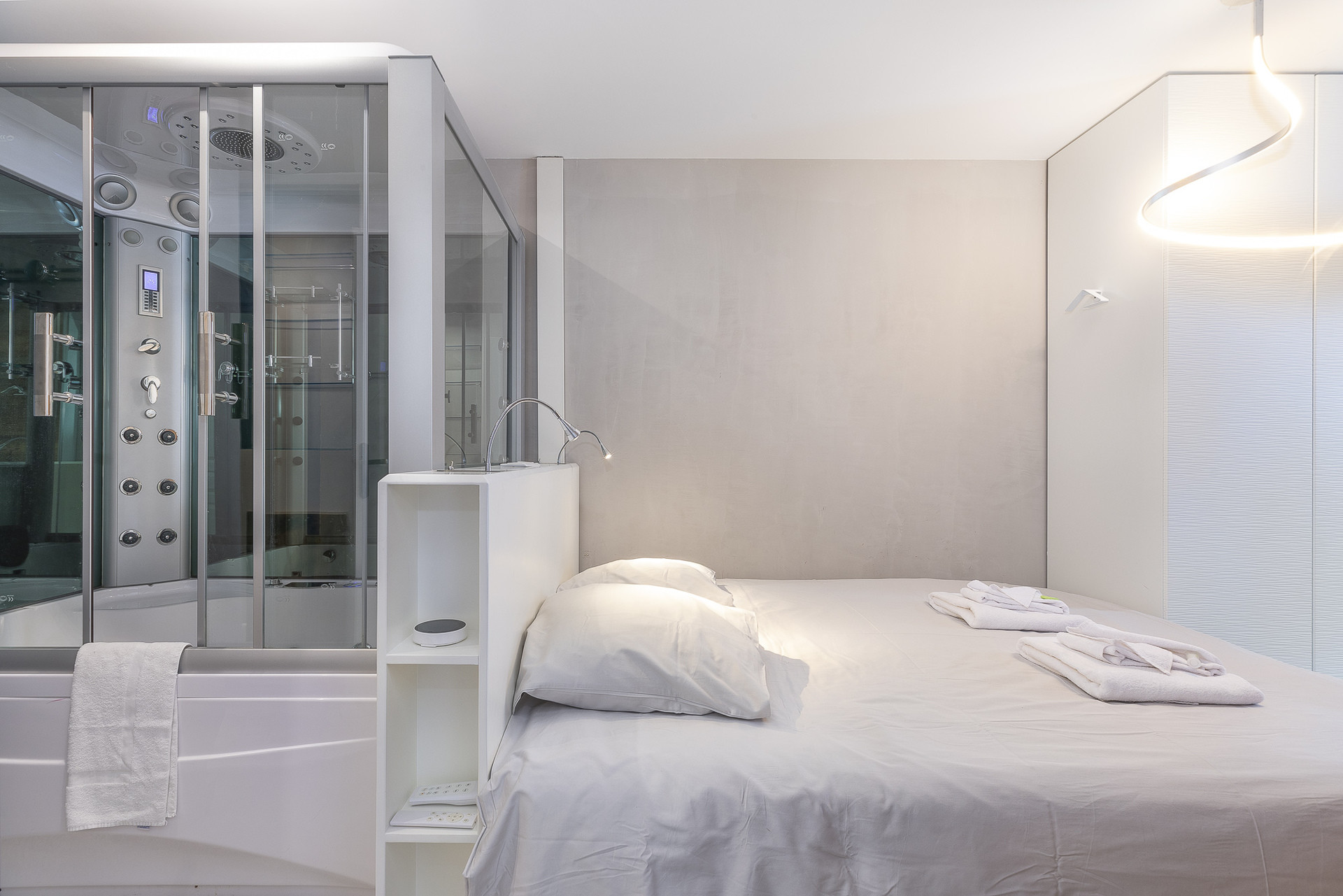 - A master suite with a double bed (160x200), private balcony, and a bathroom fitted with a whirlpool bath-shower-steam room combination