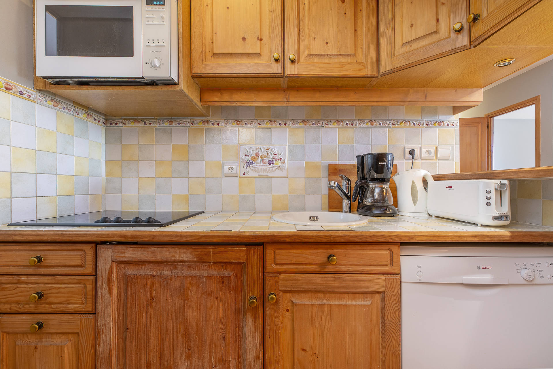 The lounge includes a dining area, a fully equipped kitchen (oven/microwave combo, ceramic hobs, dishwasher, fridge, filter coffee machine, etc.), as well as access to the south-facing balcony.