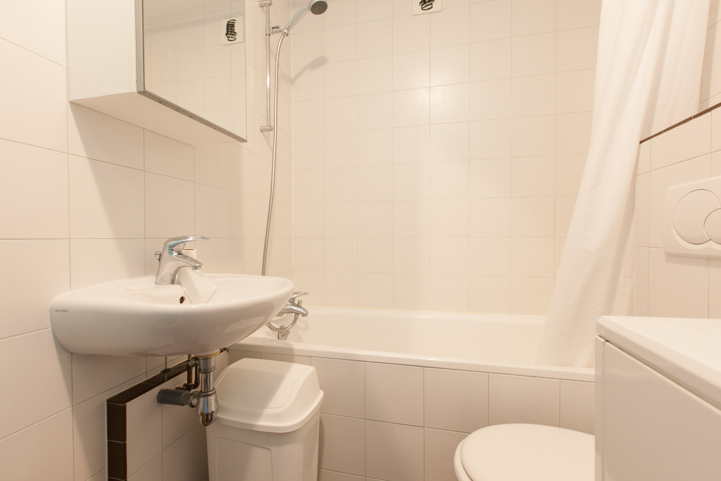The lounge features a large corner sofa with TV, dining area and a decorative fireplace (no fire permitted). The open-plan kitchen is fully equipped with a combination microwave oven, induction hob, refrigerator, coffee machine and dishwasher. From the living room, you have access to a south-facing balcony, perfect for enjoying the sunshine.