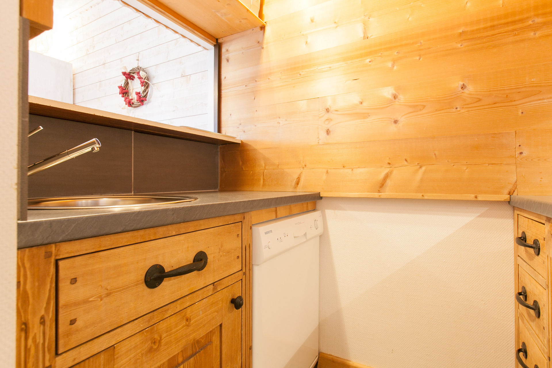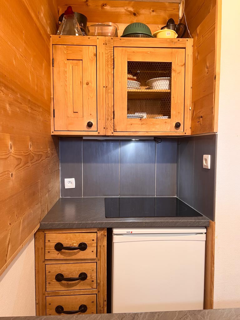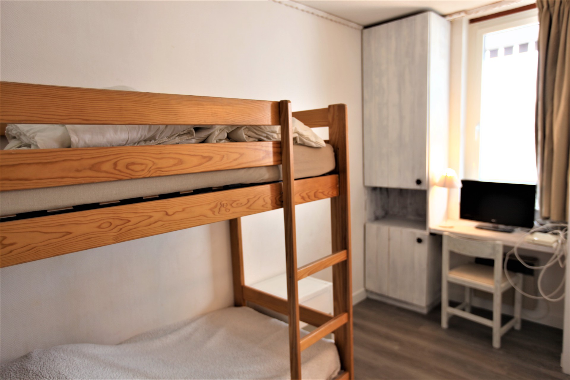 Kitchenette with 4 ceramic/electric hob plates, fridge, dishwasher, microwave - Bedroom with 2 bunk beds -