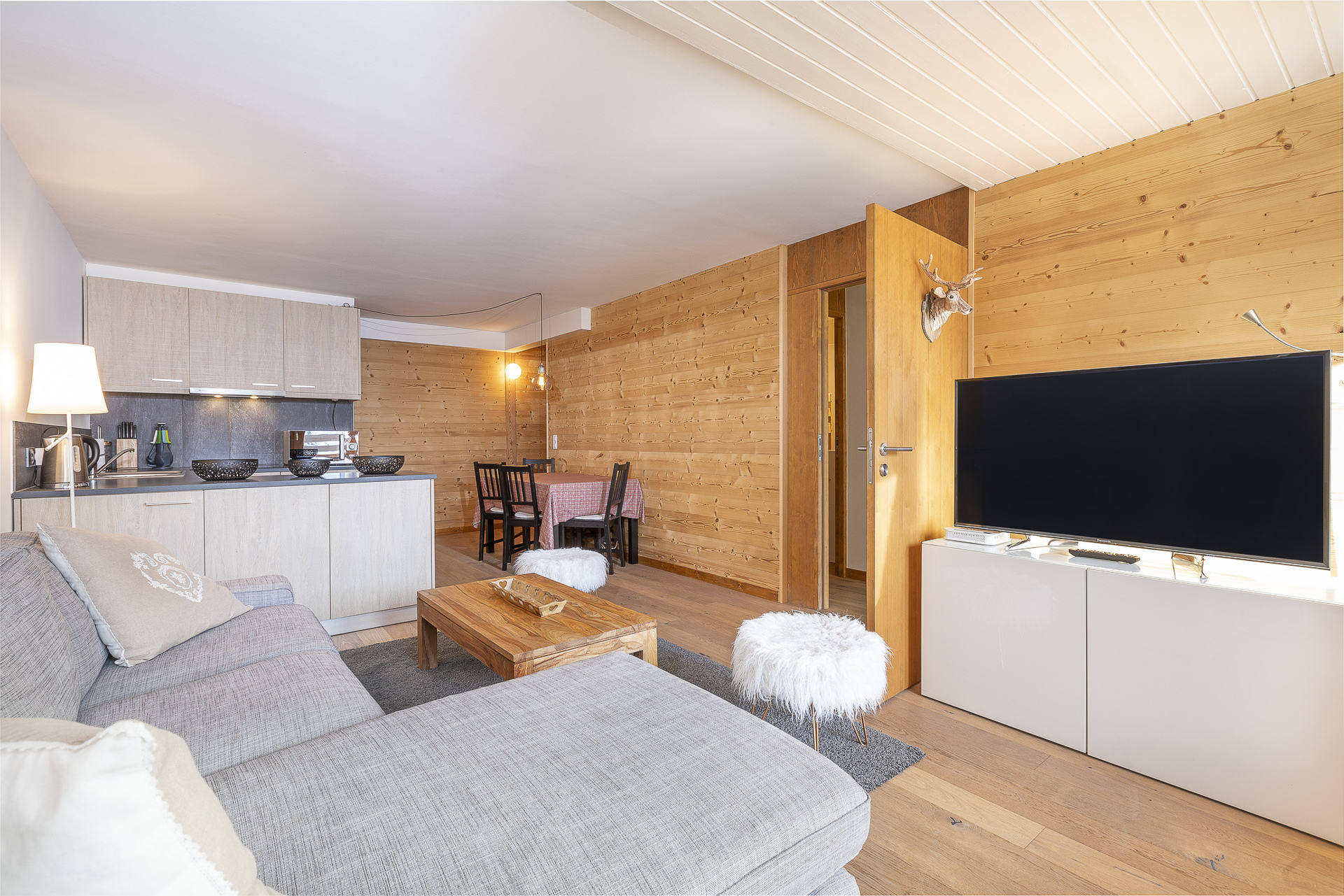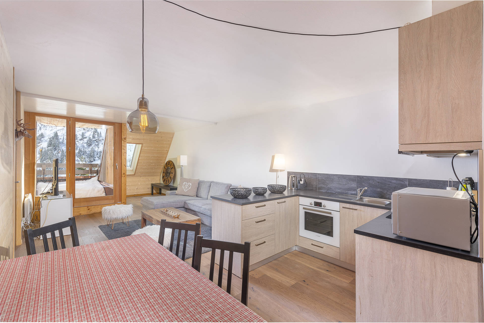 Located on the 1st floor in the MELEZES II residence in Avoriaz. Approximately 50 sqm. Television. WiFi. Ski locker. It offers quality services, in the Prestige category. Beds made upon arrival, cleaning in the middle of the stay, bathroom linen included.