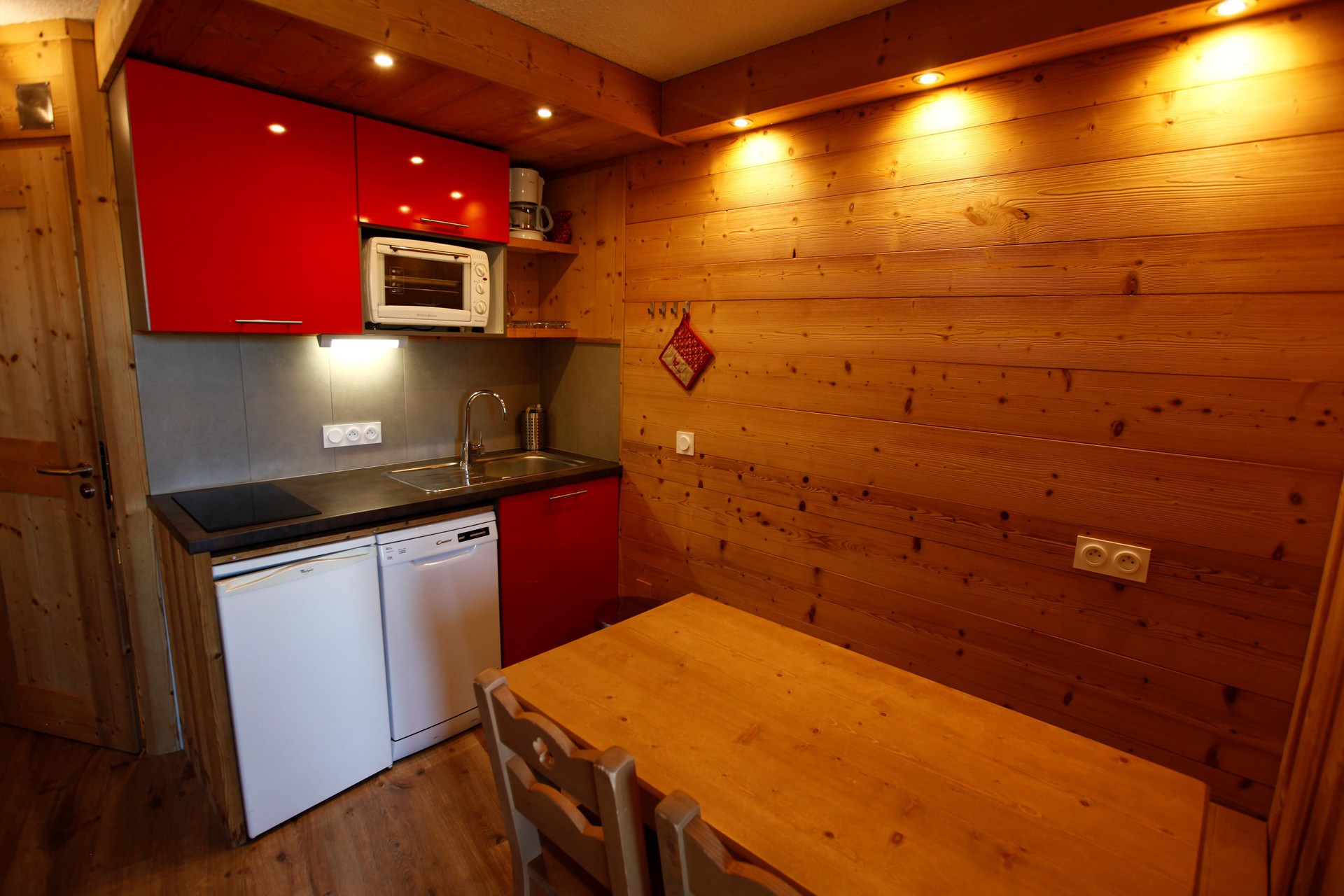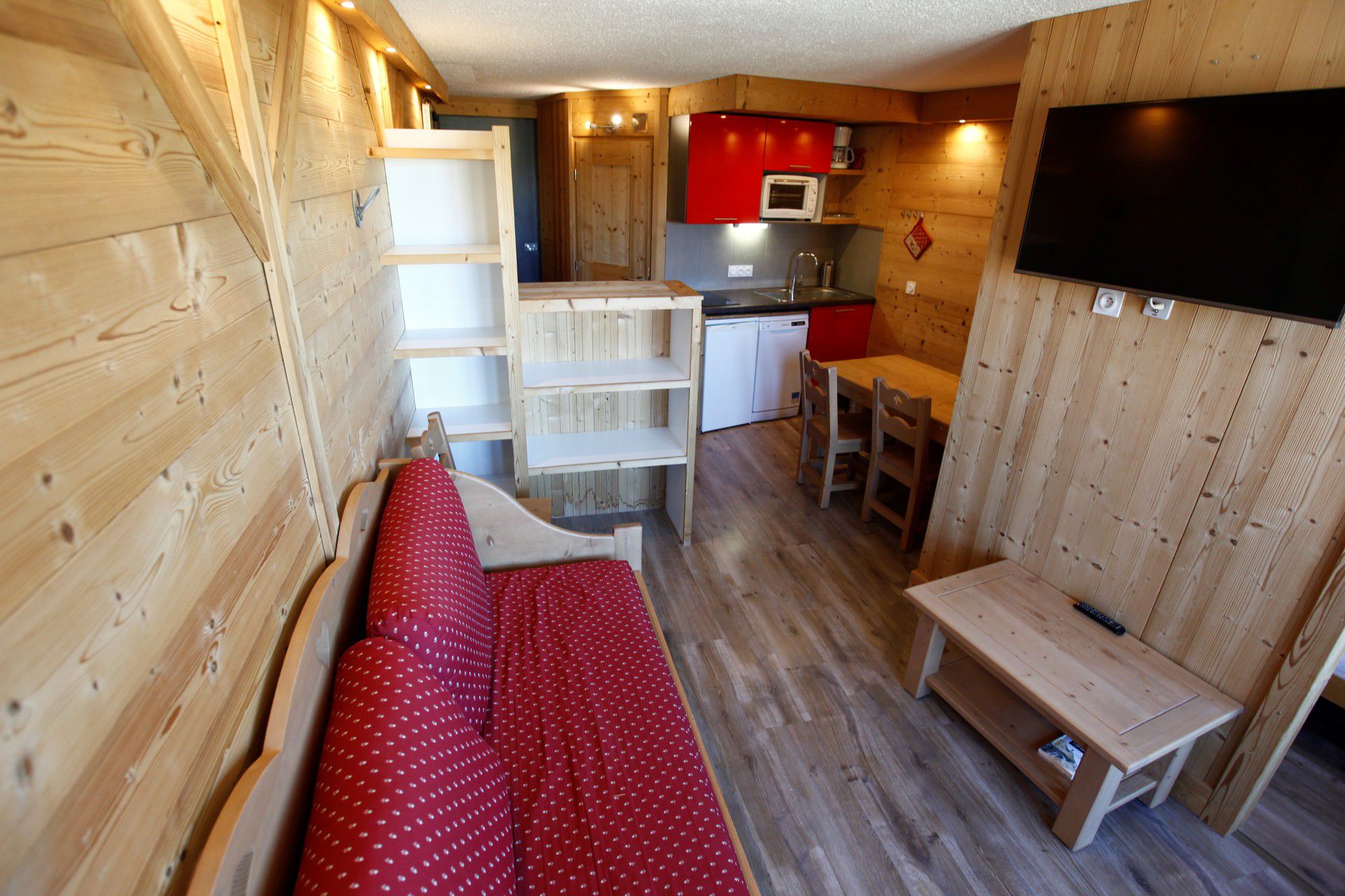 It consists of an open-plan fitted kitchen (fridge, dishwasher, oven, microwave, induction hob, filter coffee machine, etc.), a dining area, and a lounge with a sofa bed (80x190 cm) and a pull-out bed (80x190 cm). The main room opens onto a balcony overlooking the resort centre.