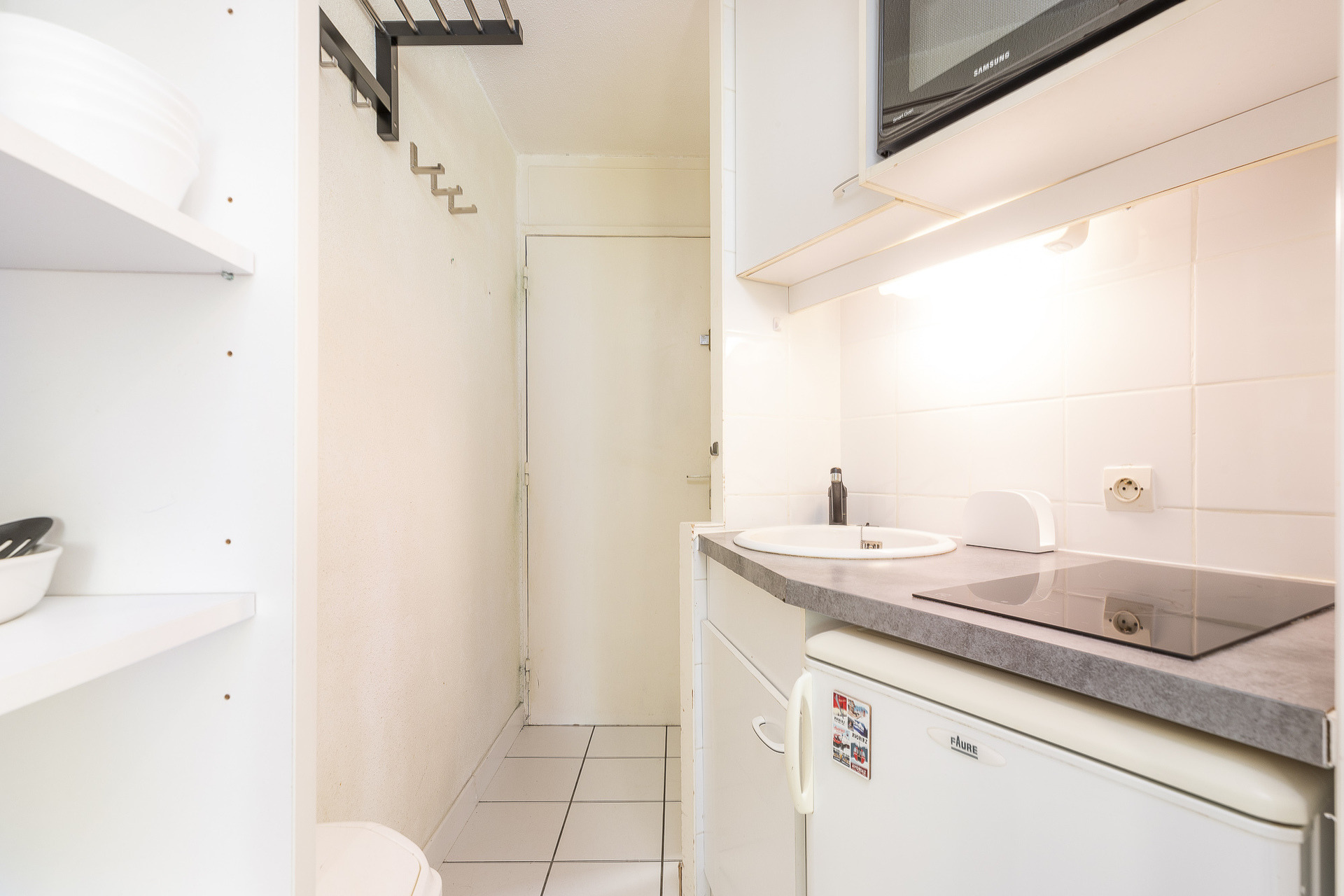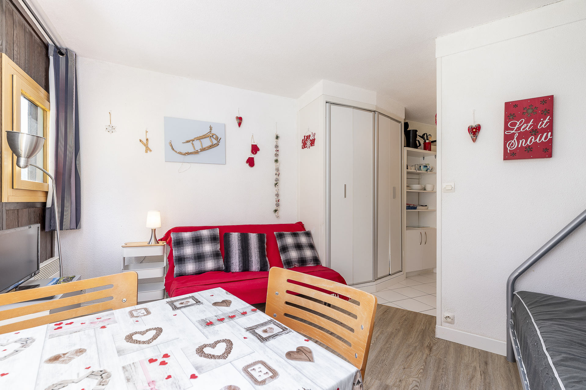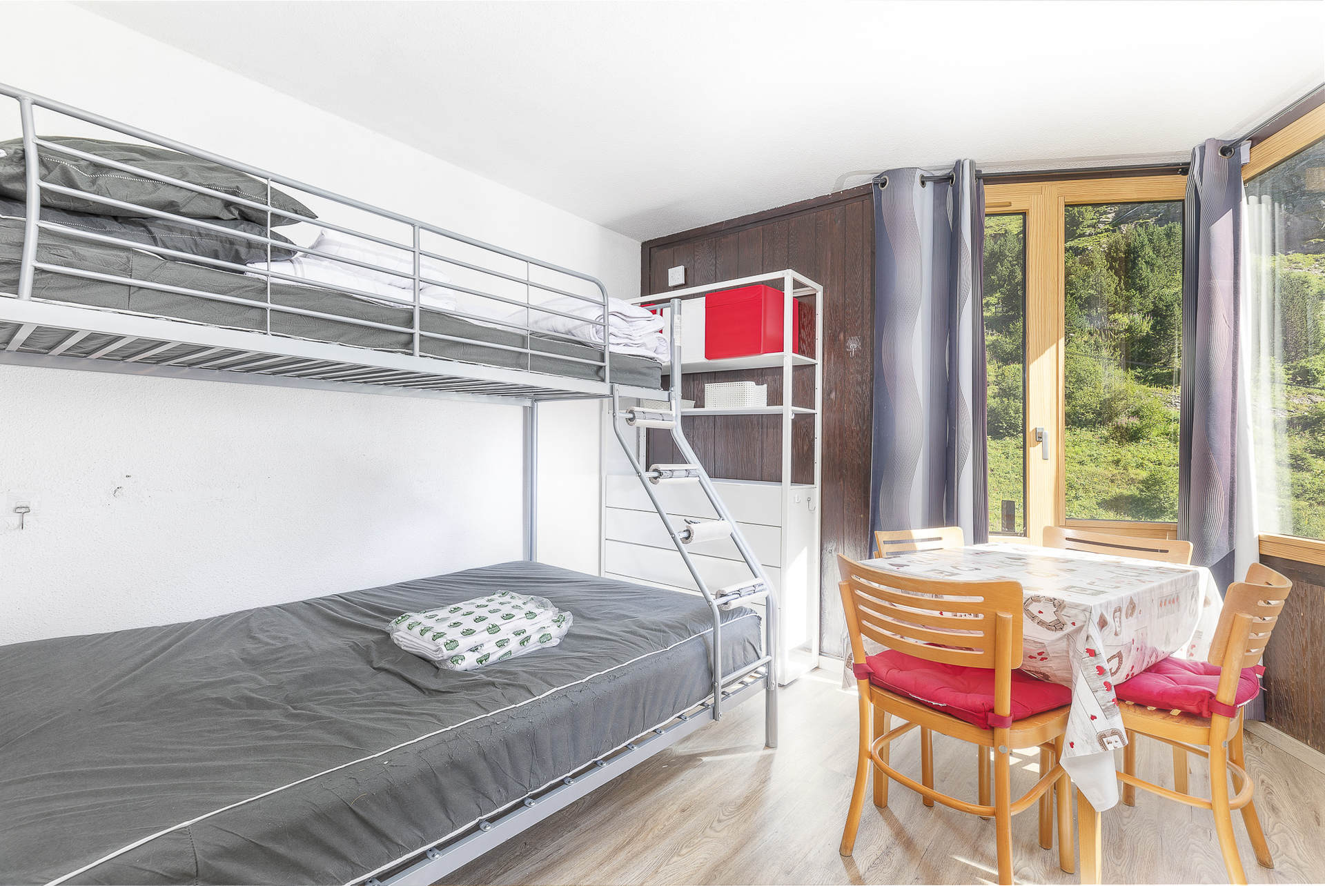 Living room : kitchen area with fridge, hotplate hobs, microwave, small oven - Dining area - 1 double bed for 2 + 1 single bed (bunk)