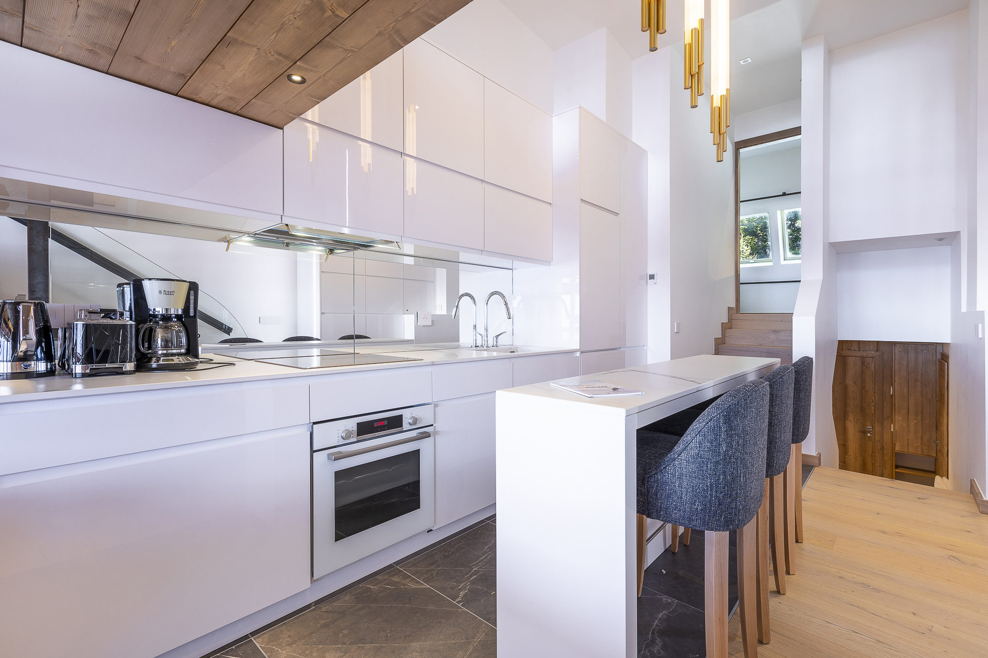 The heart of the duplex is a bright living space, bathed in natural light thanks to its south-west exposure. The large dining table seats up to 10 people, perfect for sharing meals together. The modern and functional open-plan kitchen is fully equipped (oven, microwave, dishwasher, fridge, professional Nespresso coffee machine, etc.).
