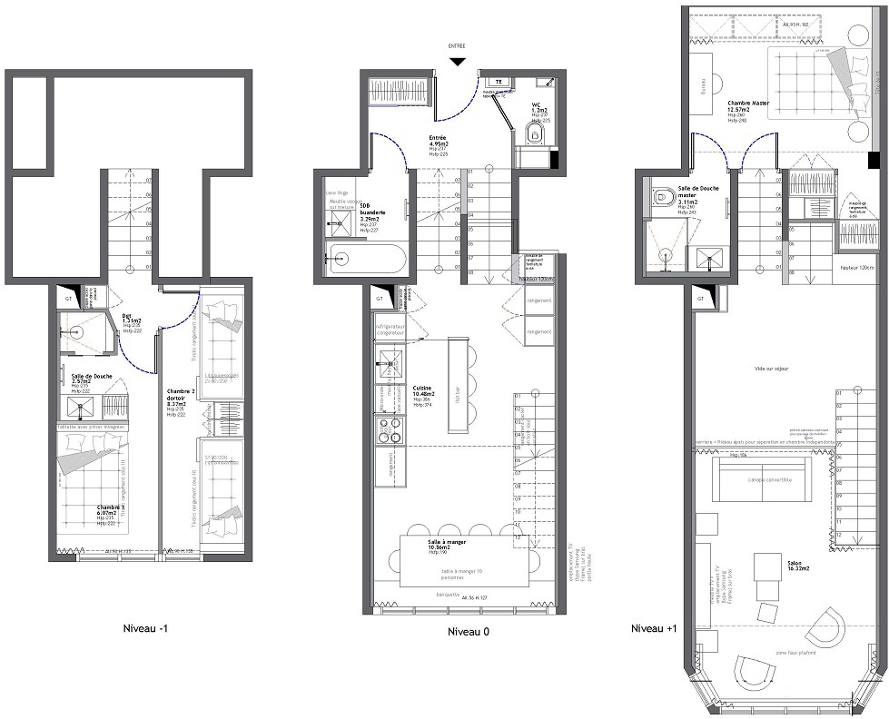 The heart of the duplex is a bright living space, bathed in natural light thanks to its south-west exposure. The large dining table seats up to 10 people, perfect for sharing meals together. The modern and functional open-plan kitchen is fully equipped (oven, microwave, dishwasher, fridge, professional Nespresso coffee machine, etc.).